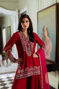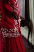 Crimson evening allure — A three-piece ensemble featuring a short red shirt paired with a velvet sharara. The shirt is detailed with embroidery and hand embellishments, while the sharara is finished with a beautifully crafted border at the hem. From ada-work sleeves to a net dupatta edged in embroidery, every element exudes refined charm. Saira Rizwan ensures a look that is effortlessly sophisticated!