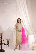 A pure 60 gms rawsilk ombre shaded olive green shirt with multi color machine embroidery on daaman and sleeves. Intricate hand embellishments on neckline , all over the front and sleeves. Kora, dabka, sequins, cut daana and rhinestones. Multi colored organza detailing on slits. Paired with pure rawsilk 60 gms capri pants. Paired with an ombre shaded hot pink dupatta. Rhinestones spray all over it.