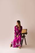 Magenta pure sheesha silk long caftan style shirt fully embroidered and appliquéd with organza and threadwork. Sequins spray all over the shirt. Tassel detailing on sleeves. Paired with sheesha silk capri pants.