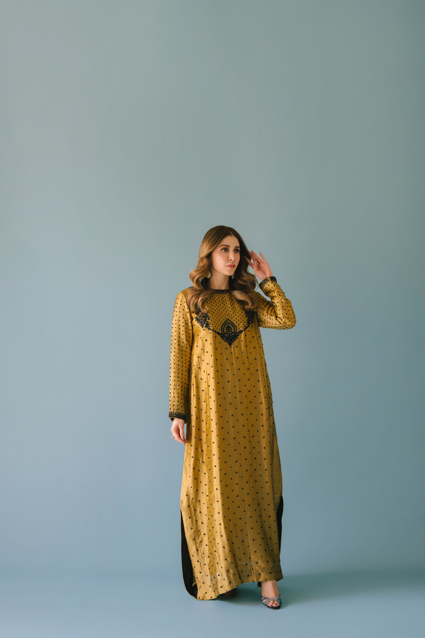 Pure sheesha silk long maxi style shirt full of hand embellishments. Cut daana, crystals, sequins, rhinestones and Kora work. We love the cut. Pure sheesha silk cigarette pants paired with it.