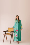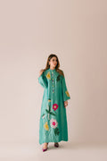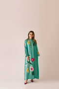 Pure aqua green long shirt with organza applique and embroidery work all over the front and sleeves. Subtle sequins spray all over the shirt. Multicolor organza detailing on the neckline and sleeves.