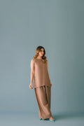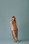 pure 80 gms rawsilk short shirt with rhinestones work on sleeves and hem. Paired with a pure 80 gms farshi shalwar with rhinestones edging on the bottom.