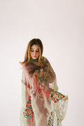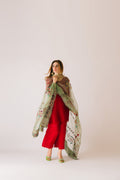 Pure sheesha silk short shirt with multi coloured embroidery and organza appliqué with sequins spray. Paired with pure sheesha silk short culottes. Thread detailing on daaman and culottes. Paired with a gorgeous sage green organza dupatta fully embroidered and appliqué work. Heavy sequins spray all over.