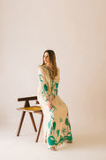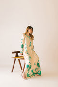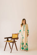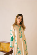 Pure sheesha silk long Maxi shirt with emerald green organza appliqué and embroidery work. Sequins hand embellishments all over. Finished with organza loops on slits and sleeves. Paired with pure sheesha silk capri pants.