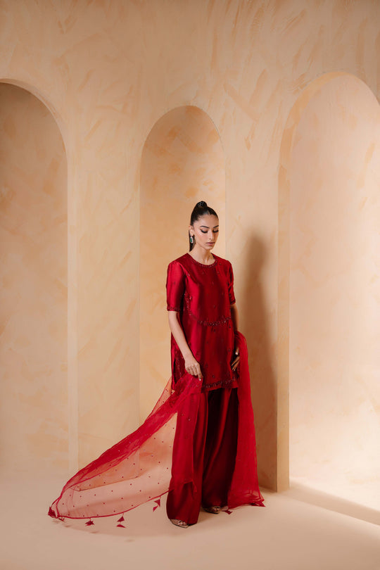 Pure red sheesha silk outfit with stunning hand embellishments all over the shirt. Sleeveless and front are full of sequins, crystals, kora, dabka and rhinestones work. Paired with khuli sheesha shalwar. Dupatta is pure medium organza with sequins and crystal spray all over. Finished with tassel detailing on both sides.