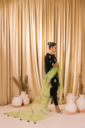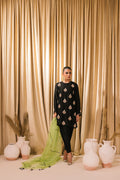 Pure sheesha silk shirt full of mukesh hand work. Motifs made of mukesh, cut daana and pita work. Paired with skinny sheesha silk pants. Pure organza dupatta with sequins hand embellishments and tassel detailing on both sides.