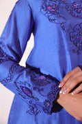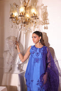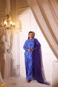 A pure rawsilk 60 gms ink blue short with gorgeous blue hand embellishments on neckline, daaman and sleeves. Kora, dabka, sequins, beads, crystals with resham work. Paired with a pure 60 gms khuli shalwar. Navy blue pure medium organza dupatta has heavy sequins spray all over.