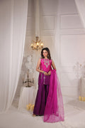 A gorgeous ombre pure sheesha silk short shirt with super intricate hand embellishments on neckline, front and sleeves. Gota, kora, dabka, rhinestones and sequins. Paired with pure sheesha silk peplum pants. Dupatta is pure medium organza with hand embellished paloo on both the sides. Rhinestones spray all over.
