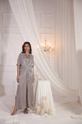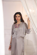 Soft tissue in beige grey color caftan hand embellished on neckline and front. Rhinestones, sequins, cut daana and resham work. Tassel detailing on slits.
