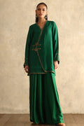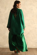 This elegant emerald green jacket in silk features intricate handcrafted gold embroidery on the front, sleeves and back, adding a touch of royal sophistication. The unique cut is both modern and graceful, creating a flattering silhouette.