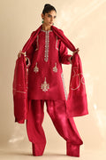 Dazzle in this stunning cherry pink, cotton silk shirt that features intricate hand embroidery on front, back and neckline. Paired with matching silk farshi shalwar OR culottes and a meticulously handcrafted silk duppatta.