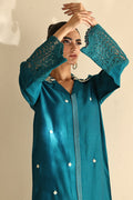 This elegant teal shirt on cotton silk features delicate white embroidery and lace detailing on front, neck and sleeves. Paired with matching culottes and chiffon dupatta with contrasting lacework.