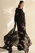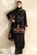 Make a statement in this elegant black silk shirt. It is adorned with vibrant floral embroidery adding a pop of color to the classic black ensemble. Perfect for both casual and semi-formal occasions. Paired with matching black farshi shalwar OR culottes and a hand painted chiffon dupatta.