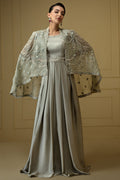 This contemporary cape cut in pure organza in pleasant shade of grey, is heavily handcrafted from front and back exuding both elegance and modern charm.