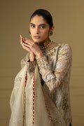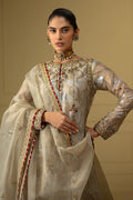 This traditional yet contemporary attire in pretty ivory shade is cut on banarsi organza, heavily handcrafted with mukesh detailing.