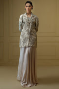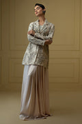 This modern and unique styled jacket, in a pristine shade of ivory is cut in an embroidered organza fabric, further enhanced with handcrafted embellishments creating a modern silhouette.
