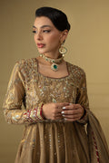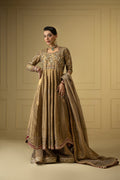This traditional zari net pishwaas in a royal shade of gold is heavily handcrafted with kora, dabka, zardozi on the bodice and sleeves, further enhanced with mukesh work on it's flair, and appliqued gota work on the hemmed scallops, making it an outfit which exudes old world charm.