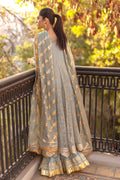 This alluring light blue peshwas has a pretty neckline with mukesh work on the neckline. It’s flair is embellished and finished off with a beautiful border. Paired with crushed lehnga and a gold printed dupatta.