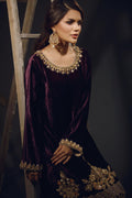 Amethyst velour shirt blended well with complex hand crafted embroidery of dabka, kora and beads on neckline, sleeves and hem, added up with detailed motifs on hemline with hanging tear drop stones.