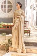 This elegant gold Saree is perfect choice for a glamorous event. The gold lame blouse is heavily embellished with gold and silver work and the saree with mukesh work gives it a regal look.