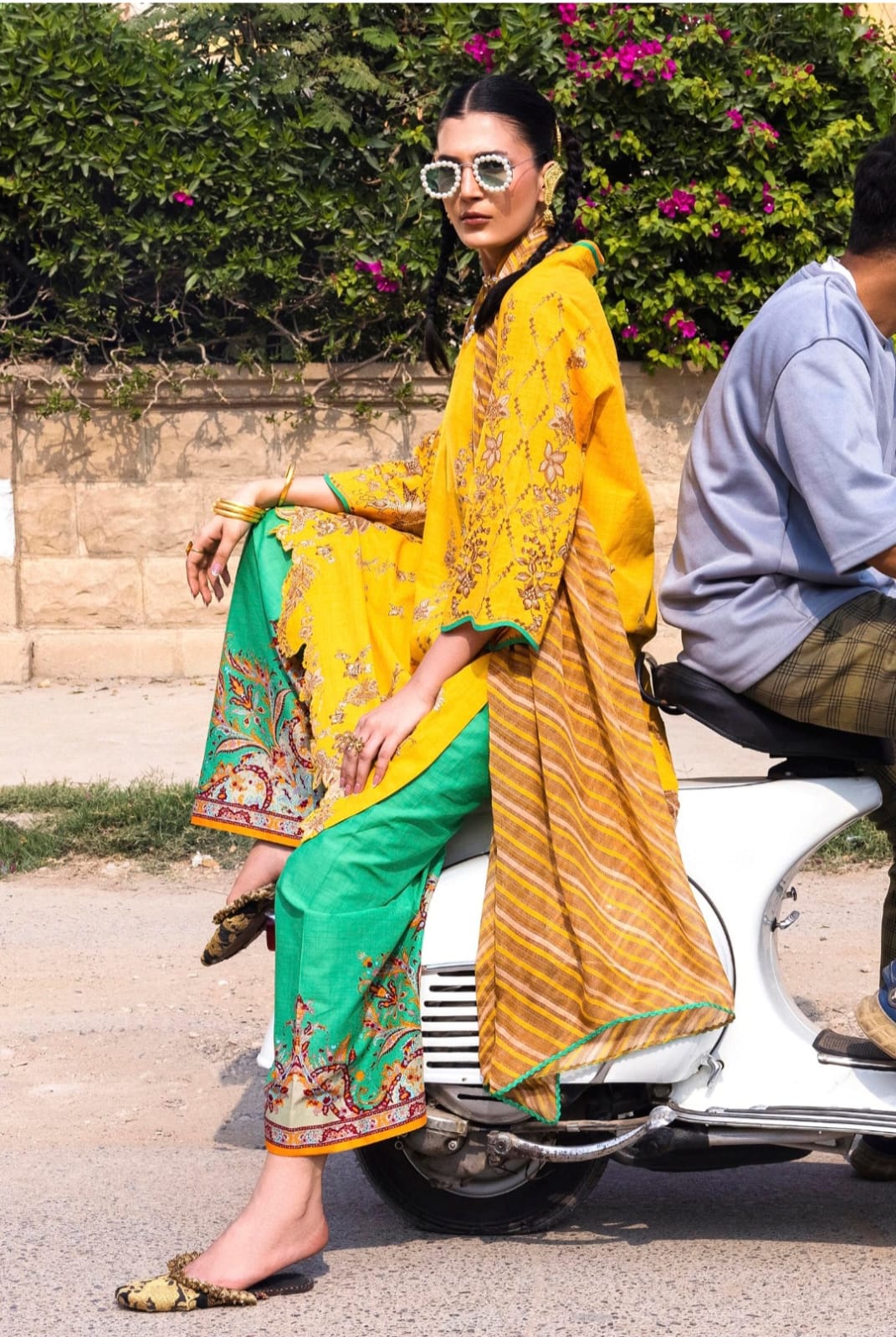 Contrasting prints meet radiant hues, turning this three-piece into a celebration of colour, movement, and presence.