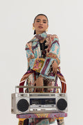 Ethnic-style multi-colored shirt paired with a striped, similarly hued rotary-printed dupatta and contrasting pants.