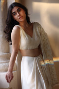 An ethereal ensemble crafted in a luminous moonlit ivory hue. The intricately hand embellished charmeuse choli glistens with delicate pearl work, paired with a sweeping charmeuse waterfall skirt cascading effortlessly. A diaphanous organza cutwork jacket adorned with artisanal embroidery lending an air of regal sophistication.