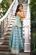 A sleeveless peplum in soft aqua khaddi silk is brought to life with with a contemporary reinterpretation of folk inspired print and delicate gota embroidery. The fitted bodice with a plunging neckline and cinched waist sculpts the silhouette. It is paired with a voluminous printed khaddi silk lehenga, where indigo and ivory motifs unfold in rhythmic symmetry and stylized florals frame the hem. A pre draped dupatta in the same print, edged with tassel accents, completes the ensemble with refined elegance.