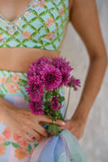 This elegant ensemble features a mint rawsilk blouse with a plunging neckline, adorned with geometric floral prints and delicate crystal embroidery. It is paired with a flowing pure rawsilk lehenga in pastel tones, where floral motifs in peach, coral and yellow lend a whimsical charm. A sheer organza dupatta in soft gradient pastels trails gracefully behind, completing the look with an ethereal finish.