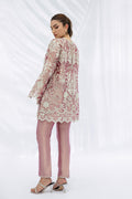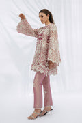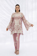 A mauve toned tissue tunic, cut in a relaxed A-line silhouette, is adorned with ivory florals, trailing vines, and eyelet detailing, finished with scalloped edges and appliqué accents. The embroidered round neckline and bell sleeves with scalloped hems lend a touch of graceful refinement. Paired with slim tissue trousers in a matching mauve, delicately embroidered with resham florals and eyelet motifs, the look carries subtle dimension.