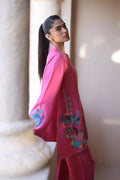 A luminous fuchsia pure rawsilk ensemble comes alive with playful botanical appliqué embroidery. The relaxed top is finished with lavender hued scalloped accents, paired with matching culottes featuring a scalloped hem and delicate embellishment.