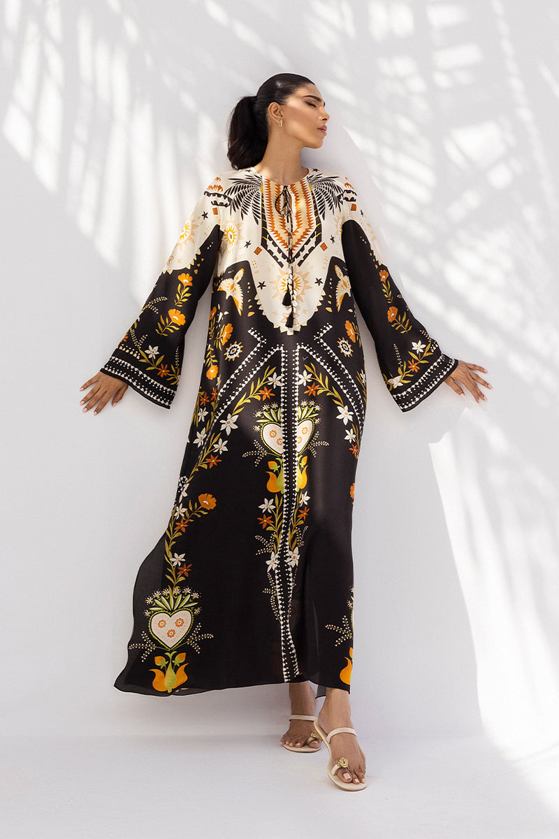 A flowing crepe kaftan, color blocked in rich ebony and ivory, offers the perfect canvas for intricate folkloric inspired motifs. The print blends geometric and floral patterns in shades of ivory, burnt orange, ochre, and olive, arranged symmetrically to create a flattering elongating effect. A tasseled slit at the neckline is framed by a geometric border and a delicately mirrored palm motif, striking a balance between artistry and effortless sophistication.