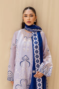 A serene lilac hued khaddi corduroy shirt flows gracefully, adorned with intricate eyelet embroidery and delicate floral patterns. Vibrant navy blue appliqué accents lend a subtle contrast. An airy navy hued organza dupatta, framed with embroidered cutwork borders and floral appliqué detailing, drapes effortlessly. Paired with matching pure rawsilk culottes, this ensemble embodies quiet sophistication.