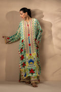 A vivacious printed set in tones of ivory, seafoam and sage, brims with vibrant florals and Mughal inspired pottery motifs in cobalt, crimson and lemon. The relaxed crepe kaftan is accented with a keyhole neckline and ornamental tassels, evoking the spirit of Mediterranean summers.