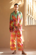A vibrant crepe co-ord set infused with artisanal flair, this ensemble is rendered in citrus sorbet tones, layered with geometric grids and botanical accents. Paired with ebony hued crepe slip and relaxed culottes mirroring the vivid palette in a sunlit plaid, striking a harmonious balance.