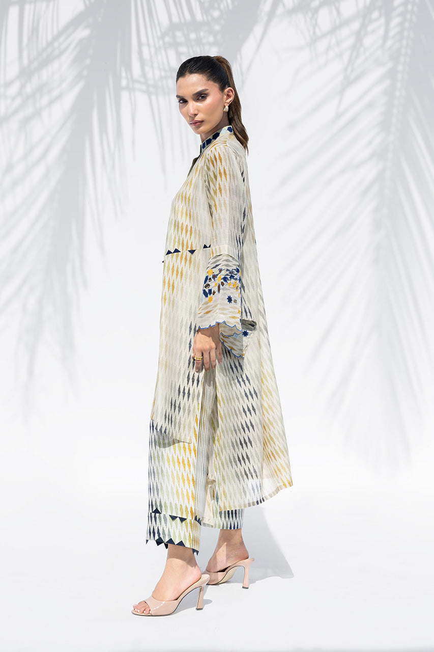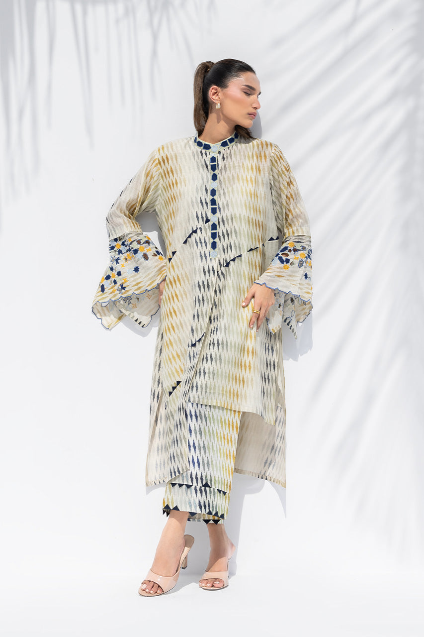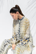 A canvas of eucalyptus green, beige, and indigo silk, this ensemble explores geometry through bold, abstract design. The relaxed shirt features an asymmetric hem, a band collar, and a button-down placket, with geometric appliqué and tukri detailing adding depth to the design. Fluid bell sleeves are elegantly finished with appliqué in shades of indigo and gold and a cutwork hem. Paired with complementary culottes that echo the artisanal tukri work, the look forms a cohesive, contemporary print-on-print expression.