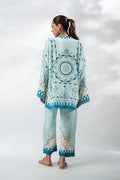 A serene crepe ensemble in soft sky blue and ivory. The relaxed silhouette features a delicate print inspired by architectural forms and fluid geometry, framed with scalloped borders and checker detailing along the neckline, sleeves, and hems. Paired with matching culottes that echo the intricate patterning for a harmonious finish.