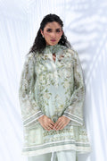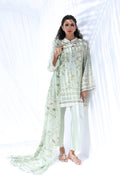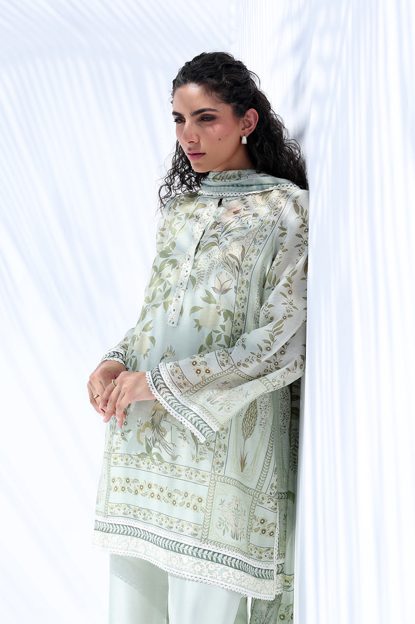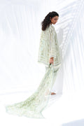 In a fresh pistachio hue, this ensemble radiates breezy elegance. The cotton net shirt features a soft botanical print and finely embroidered vines, while ivory lace trims the neckline and hem with delicate precision. Paired with pure Raw Silk culottes edged in scalloped embroidery, the look is finished with a sheer chiffon dupatta patterned in complementary tones.