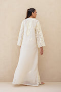Rendered in timeless eggshell khaddi corduroy, this kaftan embodies understated grandeur through intricate craftsmanship. The graceful silhouette is adorned with dense tonal aari embroidery, featuring accents of gold zardoze that flow seamlessly across the surface. A striking keyhole neckline adds modern refinement, while the straight cut and full sleeves allow the richly textured needlework to take center stage.