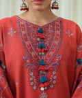 Make a statement with our three-piece embroidered rust ensemble featuring a cotton karandi shirt and trousers paired with a matching dupatta.