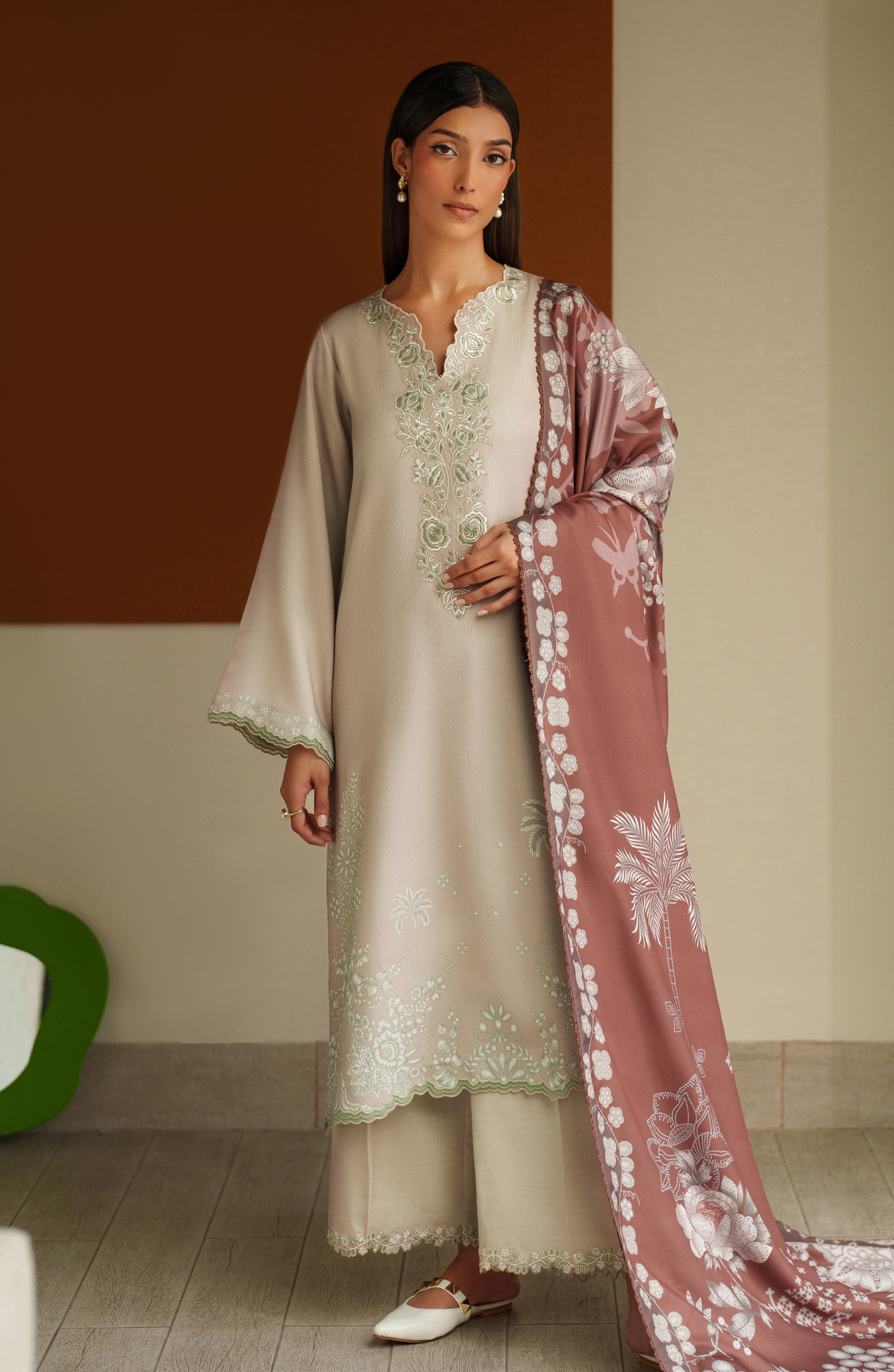 Devene embodies refined sophistication in a muted beige three-piece ensemble. The shirt showcases delicate embroidery along the neckline in soft sage and cream tones, complemented by an embroidered motif at the back. Paired with plain trousers detailed with minimal embroidery at the hem and a printed chocolate brown blended shawl, this look exudes understated charm and timeless elegance.