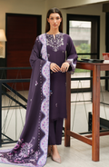 Amyra embodies timeless charm in a purple hue, crafted from luxurious slub viscose for an effortlessly graceful appeal. The shirt features refined embroidery along the neckline and sleeves, where delicate threadwork and floral motifs create subtle artistry. Paired with coordinating plain trousers and a printed blended shawl in complementary tones, this thre piece ensemble radiates understated sophistication and poise.