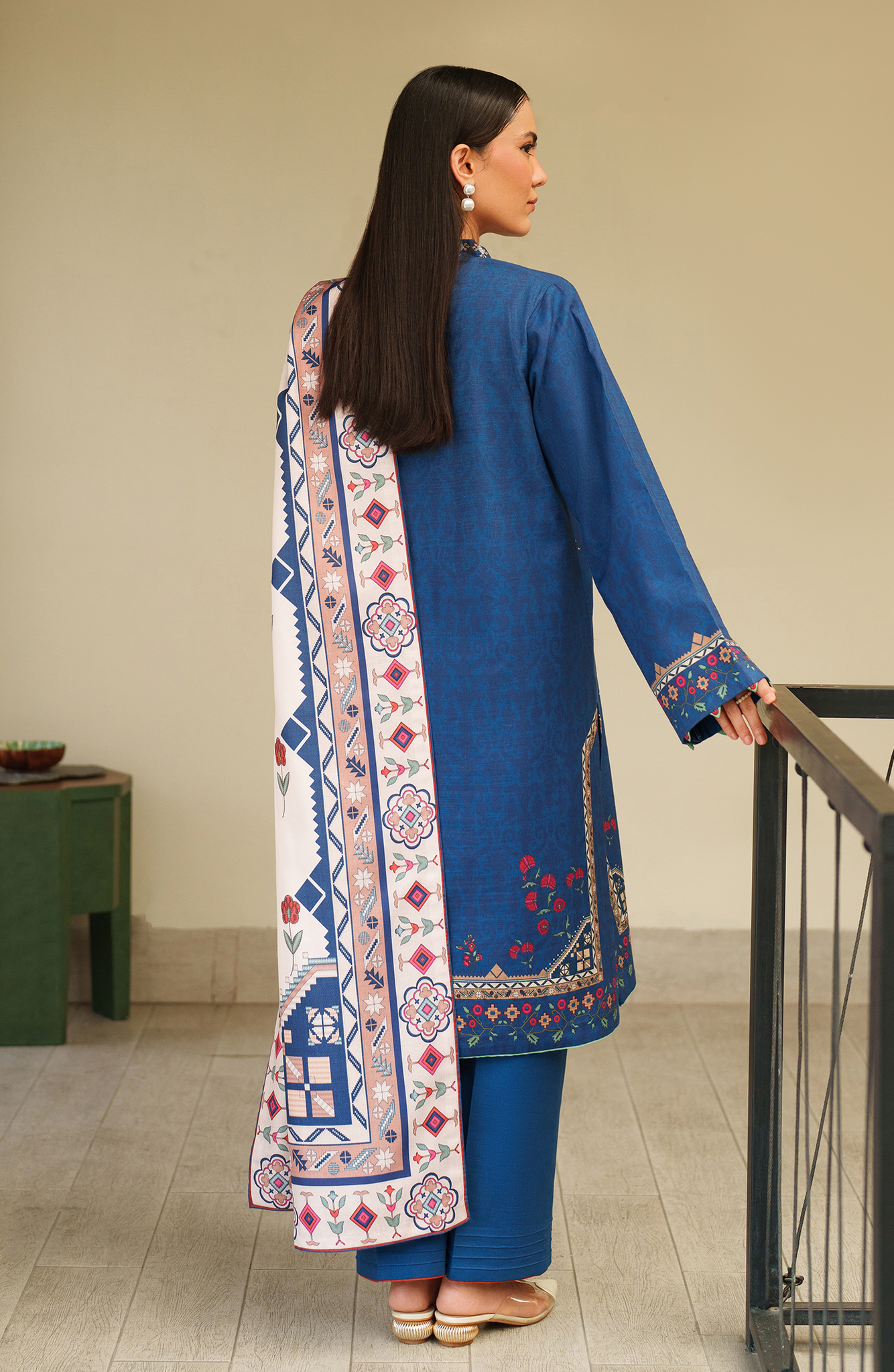 A deep azure blue slub khaddar shirt adorned with refined embroidery along the neckline and scattered motifs across the front. The sleeves are delicately detailed, while a plain matching trouser lends understated balance to the look. Paired with a beautifully printed blended shawl that celebrates art and tradition, this outfit captures the essence of serene winter charm and refined grace.