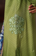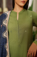 Fresh, graceful, and refined — Olirae embodies understated elegance in a refreshing olive green hue. Crafted from plain viscose, the shirt features delicate embroidery along the neckline and sleeves, with subtle floral threadwork that elevates its minimalist charm. Paired with matching trousers adorned with embroidered lace detailing at the hem, this look is completed with a striking printed blended shawl dupatta in deep navy, blooming with intricate floral and paisley patterns, a perfect contrast that enhances the ensemble’s sophistication.