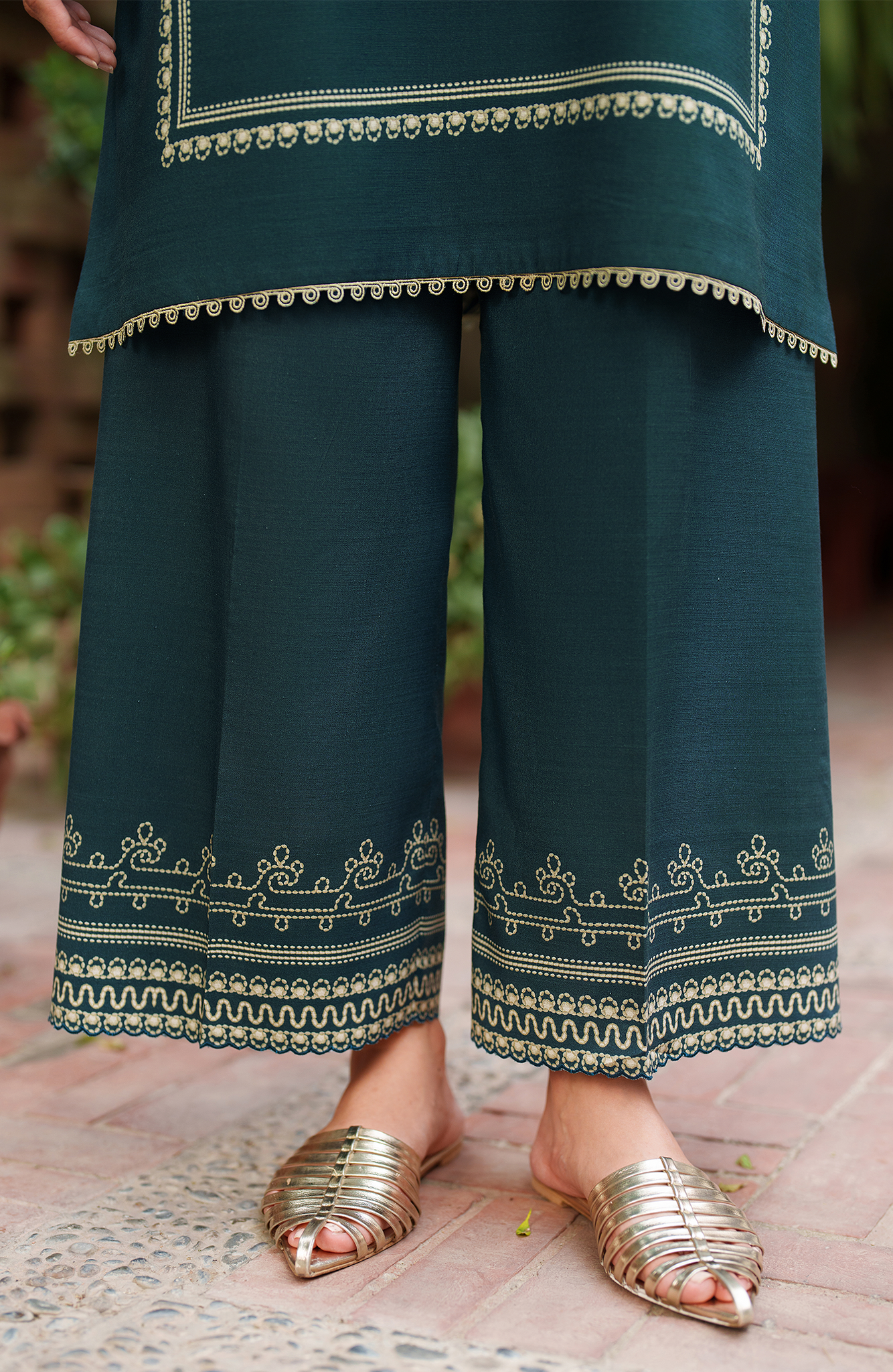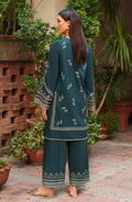 Verdure is a two-piece unstitched winter set in slub viscose. Adorned with delicate beige embroidery on a deep teal base, it offers a perfect blend of warmth and elegance. Ideal for effortless daytime or semi formal winter looks.