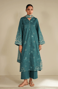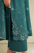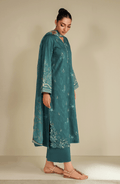 Immerse in the elegance of teal with this three-piece ensemble, featuring a cambric shirt with a digitally printed embroidered front, printed back and sleeves, and delicate embroidered corner motifs. A printed chiffon dupatta and plain cotton trousers complete the look with effortless grace.