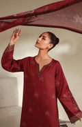A graceful three-piece set in cambric, featuring a digital printed shirt with floral embroidery on the neckline, sleeve motifs, and sleeve borders. Paired with a digital printed chiffon dupatta and plain cotton trousers, this deep garnet ensemble blends timeless elegance with modern charm.