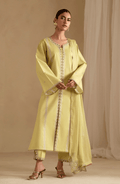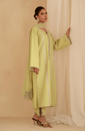 Step into effortless elegance with this stunning lime green three-piece open shirt outfit. Crafted from lawn fabric, the open-front shirt features delicate floral thread embroidery along the edges, front, sleeves, and cuffs. The chiffon dupatta is beautifully adorned with matching embroidered floral appliqué on the borders. Coordinated pants with subtle hem embroidery complete this graceful and sophisticated ensemble.