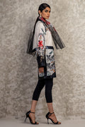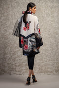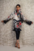 Original Shamaeel silhouette print on silk fabric beautiful bold print handmade zardozi silver and antique gold motifs appliqued on the galla. Shirt is finished with gorgeous matte sequin fabric. Pair it with pure organza printed scarf and black pants to complete the look.
