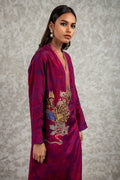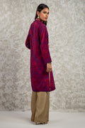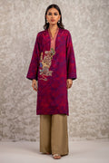 Silk classy burgundy solid short shirt with front handcrafted motif and delicate outlining. Gold dabka, nakshi, and sequins hand work on the embellishments on front with intricate details finished with golden lace. Can be paired with solid matching pants or pants as shown in the picture